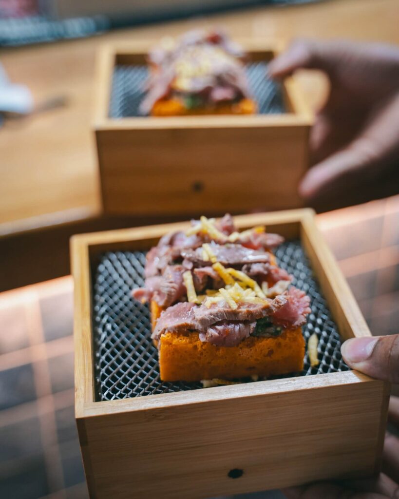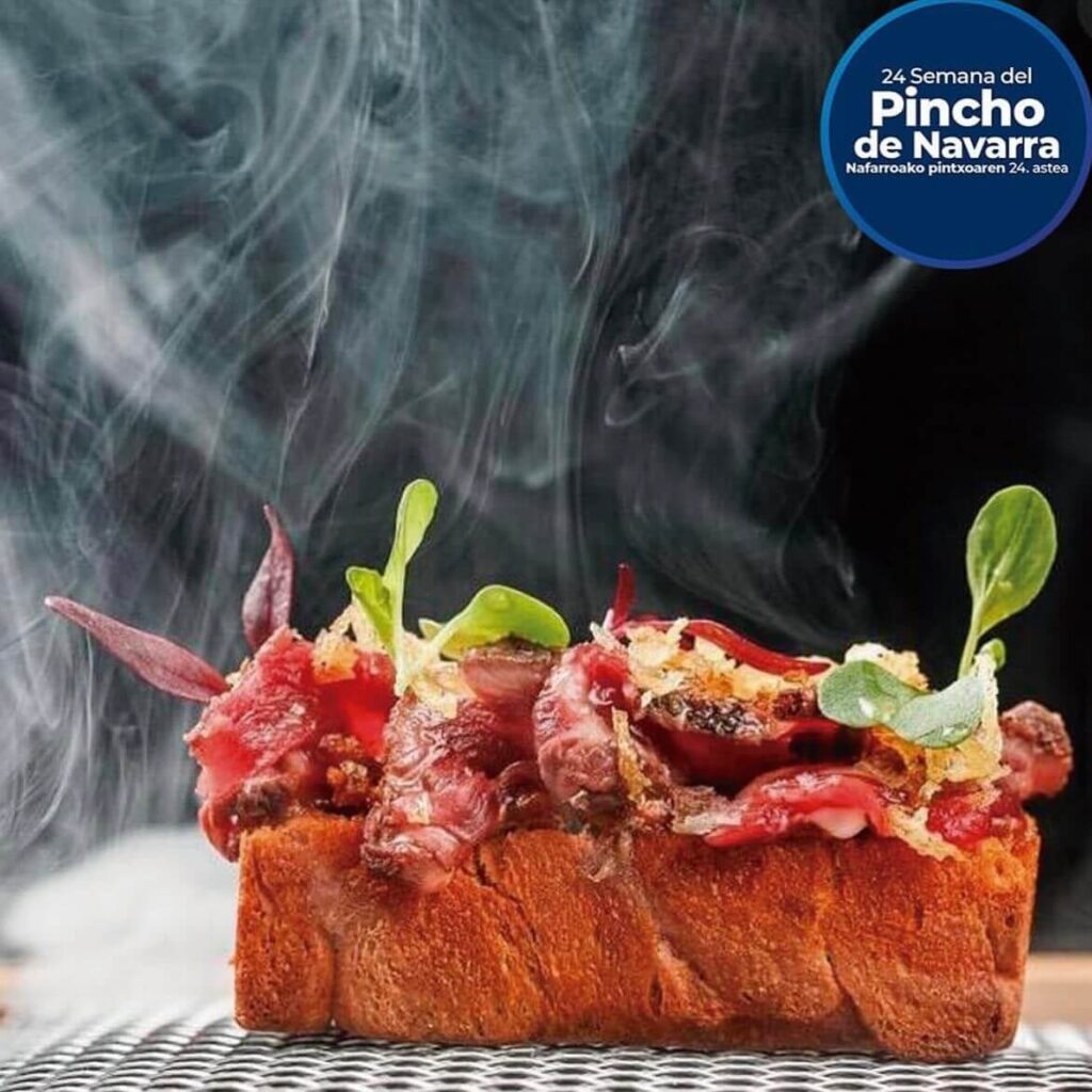 El pintxo es un homenaje a todos los asadores típicos de Navarra. Lleva pan de piquillo, guiso de churrasco madurado a la brasa, steak tartar con lechuga picada, láminas de chuletas marcadas a la brasa con grasa de la chuleta por encima y patatas paja.